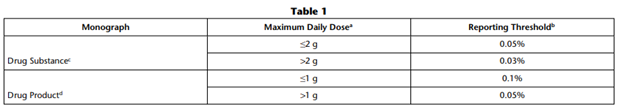 不同最大日劑量相對(duì)應(yīng)的報(bào)告閾值的數(shù)值如下所示,國(guó)際人類用藥技術(shù)要求協(xié)調(diào)理事會(huì)(ICH)指南:Q3A(R2)“新藥中的雜質(zhì)”和Q3B(R2)“新藥品中的雜質(zhì)”,轉(zhuǎn)載于表1