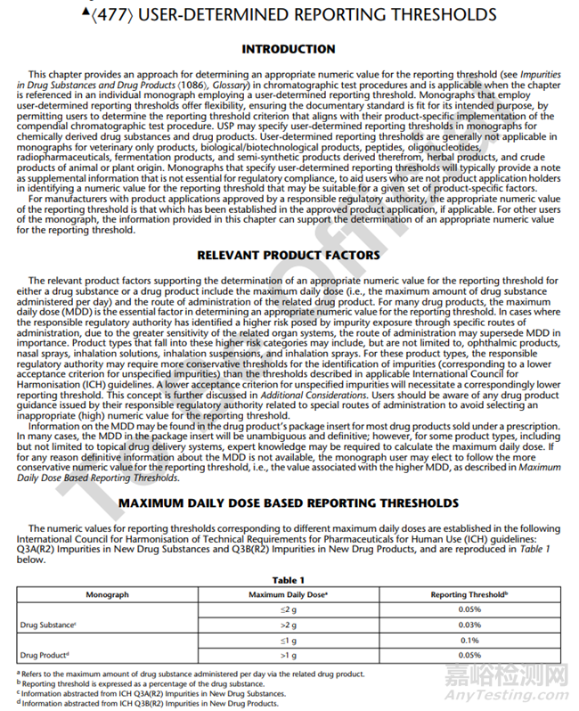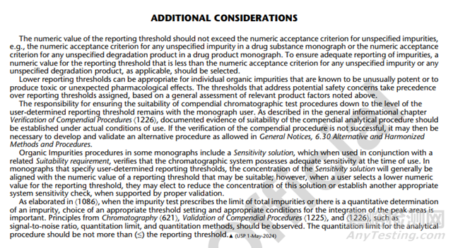 本通則引入了一種色譜分析方法中使用“用戶確定報(bào)告閾值適當(dāng)數(shù)值”的方法,在美國(guó)藥典各論中引用本通則“使用者確定的報(bào)告閾值適當(dāng)數(shù)值”時(shí)使用。在使用美國(guó)藥典色譜檢驗(yàn)方法時(shí)“使用者確定的報(bào)告閾值適當(dāng)數(shù)值“提供了靈活的,符合特定產(chǎn)品預(yù)期目的報(bào)告閾值。在美國(guó)藥典各論中”用戶確定的報(bào)告閾值“通常會(huì)提供注釋,以幫助非該產(chǎn)品持有者用于識(shí)別特定產(chǎn)品的報(bào)告閾值的適當(dāng)數(shù)值,此補(bǔ)充信息不適用于法規(guī)符合性判定。對(duì)于監(jiān)管機(jī)構(gòu)批準(zhǔn)的產(chǎn)品制造商” 報(bào)告閾值的適當(dāng)數(shù)值 “在批準(zhǔn)的產(chǎn)品申報(bào)文件中有規(guī)定,對(duì)于各論的其他用戶,本注釋提供的信息可以支持確定” 報(bào)告閾值的適當(dāng)數(shù)值“。
