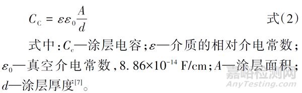 25 ℃條件下,水的相對介電常數(shù)為80,一般有機涂層僅為4~8,當涂層/金屬暴露在含水環(huán)境中,隨著水分向涂層滲透,涂層電容也會隨之增加,通過EIS檢測有機涂層電容可以間接表征滲透性。平板涂層電容,可按式(2)計算。