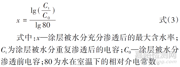 在僅考慮涂層中樹脂和水對電容的影響,忽略其他填料和基材金屬對結(jié)果的影響前提下,涂層被水分充分滲透后的最大含水率可由式(3)計算。