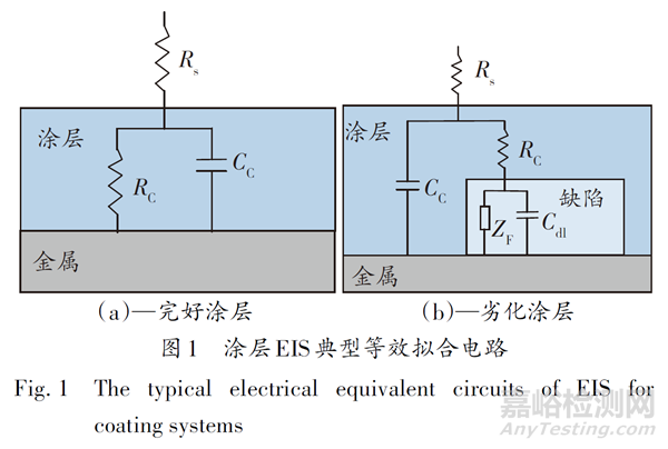 為解析EIS中的信息,需要結(jié)合EEC處理涂層阻抗數(shù)據(jù)。對于完好涂層,通常采用圖1(a)中的EEC,當涂層發(fā)生劣化,通常采用圖1(b)中的EEC。