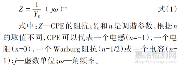 為獲取更好的擬合結(jié)果,通常需要借助常相位角元件(CPE),用于表征電極表面時間常數(shù)分布,可以分為2類:(1)沿電極表面的電流/電位或帶電粒子吸附二維分布;(2)電極表面粗糙度、涂層孔隙率或涂層成分差異的三維分布。CPE阻抗的表達式如式(1)所示。