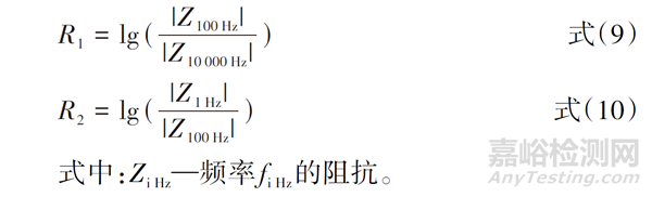 Tsai在2 個單頻下測試涂層金屬阻抗,如果2個頻率均處于電容區(qū)域,lg∣Z∣-lgf 曲線斜率為−1,則不同頻率下阻抗比與測試頻率比相同,隨著涂層損傷程度上升,該比值會因涂層電阻Rc降低而降低,R1和R2的定義分別如式(9)、式(10)所示。