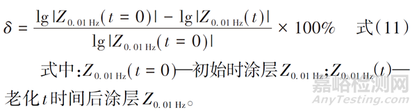 許志雄等選用lg|Z0.01 Hz|、lg|Z117 Hz|和10 Hz 時相位角θ10 Hz作為指標評價船舶涂層性能,并且定義了涂層老化系數(shù)δ,如式(11)所示。