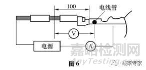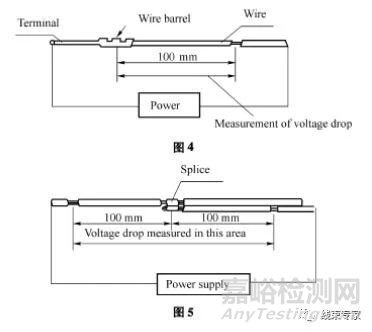 75mm長的電線處的兩點間測量,扣除75mm長的電線電壓降后即為端子與電線壓接處的電壓降。當一個端子同時連接兩根或兩根以上電線時對各根電線分別施加電流以測量電壓降。
