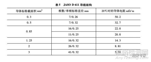 因QC/T29106、MES67010和24352NDS00引用的導線標準不一樣,對導體結(jié)構(gòu)(單根銅絲直徑和銅絲的數(shù)量)的規(guī)定并不一樣,導線標稱直徑也并不一樣。如QC/T中導線樣品線徑包括0.75mm2,并無不包括0.85mm2,如表4所示;MES和NDS標準包括0.85mm2,并不包括0.75mm2,如表5所示。