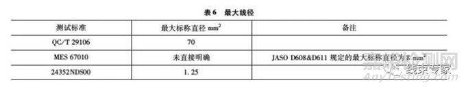 如表6所示,因QC/T、MES和NDS標準中,對導線的最大尺寸并不一樣。QC/T29106中最大標稱直徑達到70mm²。