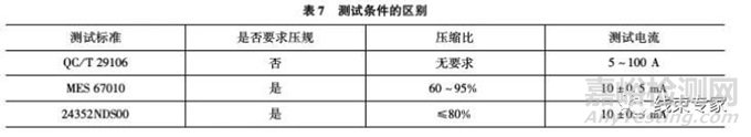 QC/T29106測試結(jié)果判定標準中,依據(jù)導線標稱直徑從0.5~70mm2的變化,最大電壓降為3~25mV/A。MES67010沒有區(qū)分線徑,端子壓接的最大電壓降應為2mV/A,接線端子的最大壓降應該為3mV/A。24352NDS00依據(jù)導線標稱直徑從0.3~1.25mm2的變化,最大電壓降為1.2~3mV/A。從上可以看出判定標準最寬松的為QC/T29106,0.5mm2、0.85mm2和1.25mm2的線徑中,24352NDS00判定標準最嚴格,0.3mm2的線徑中,MES67010判定標準最嚴格。