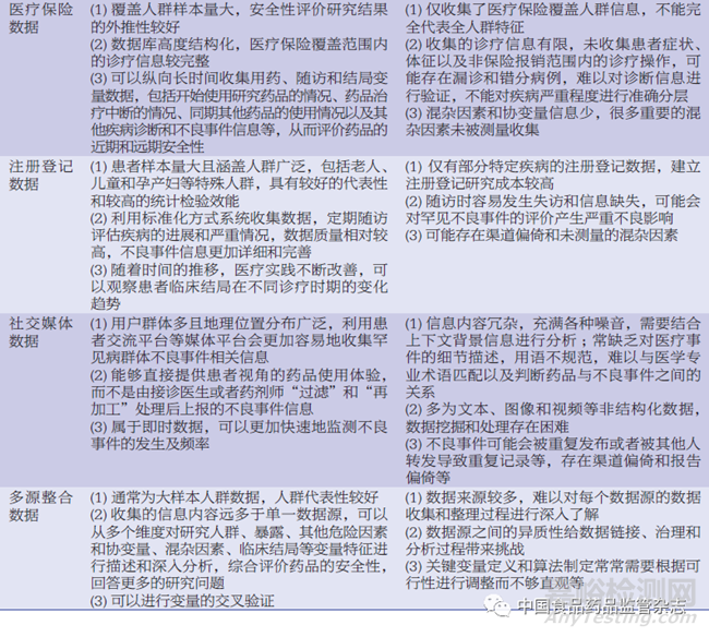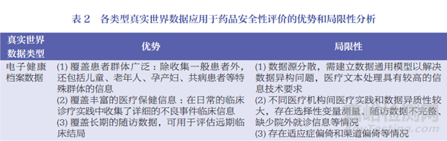 上述各類型的RWD應(yīng)用于藥品安全性評(píng)價(jià)的優(yōu)勢(shì)和局限性匯總分析見表2。