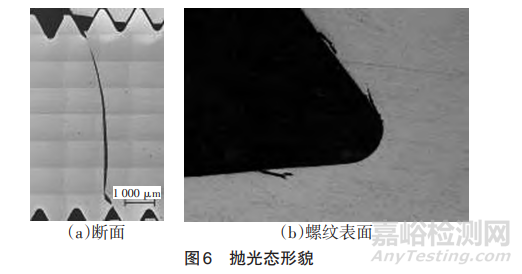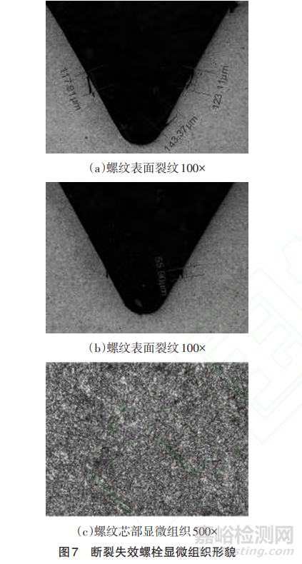 將斷裂失效螺栓沿軸向剖開并制備金相試 樣,采用蔡司 Axio Imager.M2m 金相顯微鏡對斷裂 失效螺栓的裂紋區(qū)斷面顯微組織進行觀察。試樣 在拋光狀態(tài)(未侵蝕)時,可見斷裂部位沒有明顯 的宏觀塑性變形痕跡,斷裂起源于螺牙溝槽部位, 而后沿剪切面向螺桿中心部位繼續(xù)擴展至最終斷 裂,且裂紋起始區(qū)及其擴展區(qū)斷面較為平整(圖 6a)。金相顯微鏡同時檢測到螺桿上很多螺紋中 經(jīng)和溝槽處呈鋸齒狀形態(tài)的表面裂紋,裂紋的尾 部長短不一,且較尖細(圖6b)。