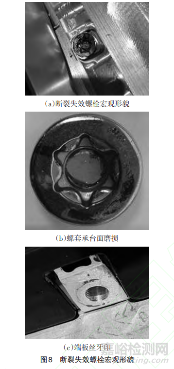 為了查找螺栓斷裂的原因,對影響電池模組 固定螺栓斷裂失效的配合關(guān)系進行了全面的調(diào)查 分析,該螺栓斷裂部位處于螺紋中部的電池箱體 非標螺套鎖緊位置(見圖 8a),即疲勞斷裂位置是 螺栓電池箱體非標螺套嚙合的第一個螺牙的牙底 處。另外,電池模組安裝凸臺非標螺套承臺面處 有磨損痕跡(見圖 8b),說明在進行 Z 向振動時螺 栓連接受外界循環(huán)剪切載荷作用發(fā)生的自松弛, 導致電池模組端板與非標螺套承臺面發(fā)生振動磨 損。同時,在對電池模組檢查發(fā)現(xiàn)其端板與非標 螺套承臺面接觸的位置也有磨損現(xiàn)象,端板螺栓 安裝孔邊緣還有絲牙痕跡(圖 8c)??梢?,斷裂失 效螺栓與電池模組端板存在過盈配合現(xiàn)象,螺栓 在擰緊的過程中,螺紋受較大副摩擦力的作用容 易在螺紋表面萌生顯微裂紋成為疲勞源。疲勞源 形成后,在進行Z向振動時顯微裂紋在交變應力作 用下不斷擴展,直至最終斷裂。