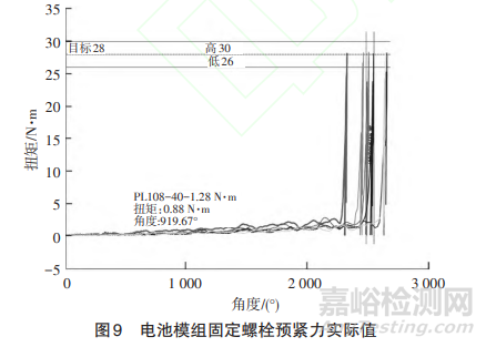 螺栓預緊力的存在,除了使零件之間產(chǎn)生緊 密聯(lián)接,增強聯(lián)接的剛性之外,還會大幅度降低 在拉伸載荷作用下螺桿應力的變化幅度,由此提 高了螺栓聯(lián)接的疲勞強度[1] 。在眾多的案例中, 將螺栓緊固到設計預緊力是提高螺栓副疲勞壽 命的有效手段。為此,調(diào)取該斷裂失效螺栓所在 電池模組的全部固定螺栓的實際裝配預緊力扭 矩數(shù)據(jù),如圖 9 所示。從圖 9 可以看出,實際裝配 預緊力扭矩均符合工藝參數(shù)(28±2)N·m 的設計 要求。