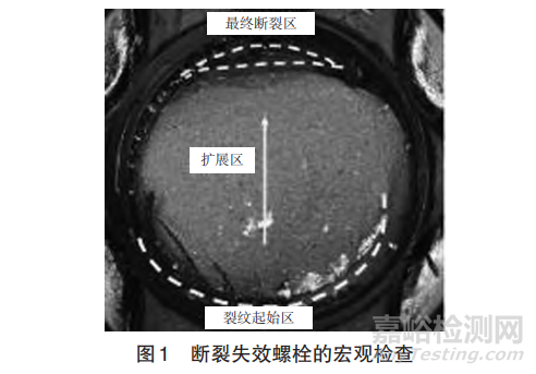 通過對斷裂失效螺栓的斷口進行宏觀檢查, 螺栓斷口宏觀形貌如圖1所示,斷口的疲勞擴展區(qū) 面積分別約占整個斷口面積的95%,斷裂部位沒有明顯的宏觀塑性變形痕跡,斷裂起源于螺栓電池 箱體非標螺套嚙合的第一個螺牙的牙底處。斷口 起始區(qū)和擴展區(qū)局部磨損發(fā)亮,裂紋起始區(qū)隱約 可見貝紋線,擴展區(qū)平整光滑,最終斷裂區(qū)存在較 小區(qū)域的剪切唇。