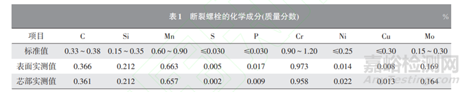 采用德國斯派克臺式直讀光譜儀 SPECTRO? MAXx 07 對斷裂失效螺栓的材質(zhì)進行初步檢測分 析,檢測分析結(jié)果如表 1 所示。由表 1 可見,斷裂 螺栓的材質(zhì)符合 SCM435 的 JIS G 4053—2016《機 械結(jié)構(gòu)用低合金鋼》標準。