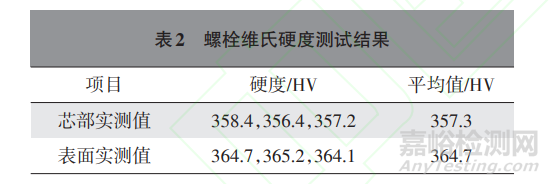 采用 司特爾 DuraScan 50 維氏硬度計對斷裂 失效螺栓取樣進行維氏硬度測試,測試結(jié)果如表 2 所示。根據(jù) GB/T1172—1999《黑色金屬硬度及 強度換算值》可得螺栓的抗拉強度為 1 148 MPa, 另外根據(jù) GB T 3098.1—2010《緊固件機械性能 螺 栓、螺釘和螺柱》表 3 要求,螺栓的維氏硬度應在 320~380 HV,表面硬度不應比芯部硬度高出 30 個 維 氏 硬 度 值 ,10.9 級 的 表 面 硬 度 不 應 大 于 390HV 0.3,抗拉強度應在 1 040~1 220 MPa???得知該斷裂失效螺栓的硬度和抗拉強度均符合 制造標準要求。