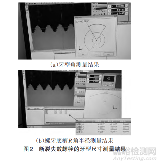 螺栓受力時,螺紋溝槽處容易產(chǎn)生應力集中, 其值在很大程度上取決于螺紋溝槽的形狀。一般 而言,螺紋的溝槽越平滑,應力集中就會越小,疲勞 強度則越高。為確認斷裂失效螺栓牙型尺寸對疲勞 特性的影響,采用影像測量儀VMS-5040MZ對其牙 型尺寸進行測量,測量結(jié)果如圖 2 所示,牙型角為 60.899 5°,螺牙底槽R角半徑為0.205 1 mm,符合米 制普通螺紋牙型角2α=60°(α表示牙型半角)和底槽 R角半徑大于 0.125 P(P 為 1.25 mm)的要求,可見 斷裂失效螺栓的牙型尺寸符合制造標準要求。