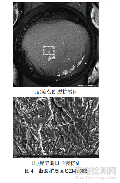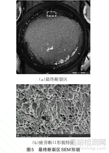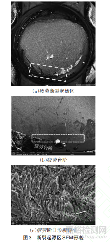 為弄清該螺栓斷裂失效的機理,將其斷口物理清洗后置于蔡司 Gemini SEM 460 掃描電鏡下觀 察,如圖 3~圖 5 所示,可見斷口起始區(qū)存在磨損現(xiàn) 象,且微觀形貌主要時疲勞特征,未見明顯加工缺 陷。擴展區(qū)的微觀斷口形貌主要是疲勞特征,最 終斷裂區(qū)的微觀斷口形貌主要為韌窩。