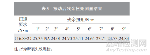 在進行Z向振動測試試驗進行到約12 h后,對 故障電池模組固定螺栓的殘余扭矩進行測量,測 量結(jié)果如表 3 所示。由表 1 可見,故障電池模組固 定螺栓在高頻振動的作用下扭矩衰減并不明顯, 且殘余扭矩均大于 60%(工藝設計參數(shù)要求為 (28±2)N·m,滿足要求。