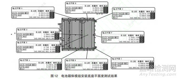如圖 10 所示,電池模組由電池箱體上的 9 個 固定安裝底座平衡支撐,有研究表明,螺栓過早疲 勞斷裂原因之一是被接觸面不平整,因此安裝底 座的平面度是一項重要的質(zhì)量指標。