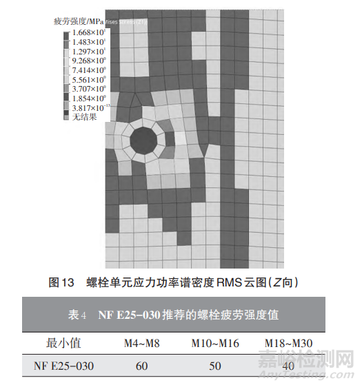 NFE25-030又給出了高強螺栓的許用動態(tài)應 力,該推薦值對應的存活率為99%,置信度為95%, 平均應力為0.3~1.0倍的屈服強度,循環(huán)次數(shù)為 3.0×106次。其值如表4 所示。由此可見,即便振 動最大外載荷即便全部加載在緊固件上,該新能 源汽車電池模組固定螺栓的疲勞強度仍低于推薦 的螺栓疲勞強度值。