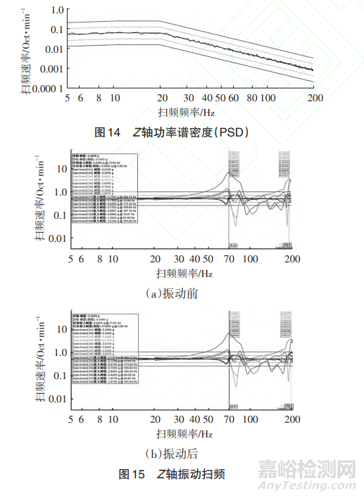 參考標準GB 38031—2020《電動汽車用動力蓄 電池系統(tǒng)安全要求》進行隨機振動試驗。將該新能 源汽車電池包通過夾具固定在振動臺上,電池包和 夾具的固定方式、螺栓規(guī)格和實車裝配保持一致??刂泣c傳感器布置在夾具與固定電池包的螺栓附 近,采用 4 個對角位置的傳感器的進行算術(shù)平均 值控制,功能檢查正常后在 Z 向施加隨機和定頻 振動載荷,隨機振動功率譜密度見圖 14。在隨機 振動前后進行掃頻試驗,以測試樣品的固有頻 率,掃頻頻率 5~200 Hz,振動加速度 0.5 g,掃描 速度 1.0 oct/min。Z 方向振動前后的掃描數(shù)據(jù)見 圖 15,由圖可見 Z 方向振動前一階固有頻率是 70.20 Hz,振動后的一階固有頻率是 68.95 Hz,試驗 前后主頻衰減率為1.78%,變化并不大,說明振動系 統(tǒng)的穩(wěn)定性很好,可見螺栓斷裂失效的原因并非是 振動設備和振動試驗過程中異常導致的。