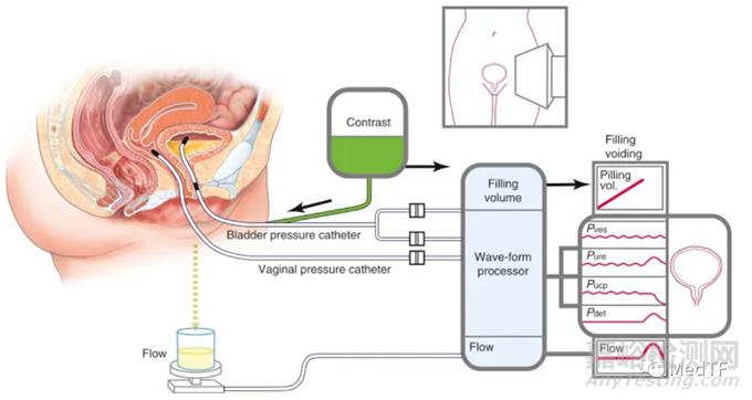 尿動力學(xué)評估通常需要膀胱中的一根導(dǎo)管和直腸中的另一根導(dǎo)管。在要求患者排尿之前,膀胱會被排空并人工充盈。