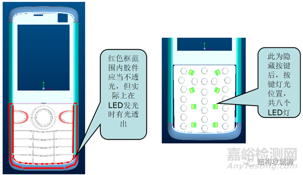 因按鍵處的LED燈有強(qiáng)的直接照射效果,因此最容易出現(xiàn)露光的地方在按鍵區(qū)域,如底面殼的不完整的止口,按鍵局部無遮光片等。