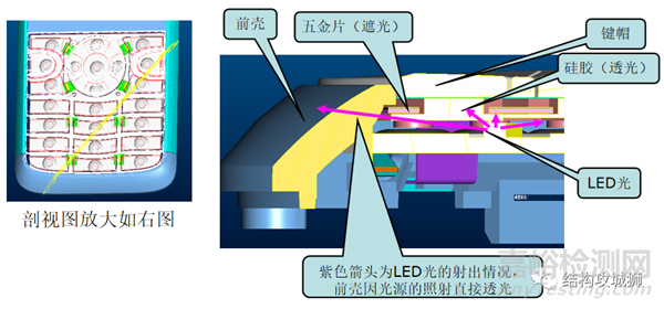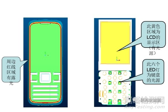 在產(chǎn)品的內(nèi)部光源的直接照射下,如果沒有擋光的結(jié)構(gòu)或擋光的結(jié)構(gòu)太少(常出現(xiàn)在裝配縫隙處)會(huì)使內(nèi)部光在不應(yīng)該出現(xiàn)光的地方而直接露出。