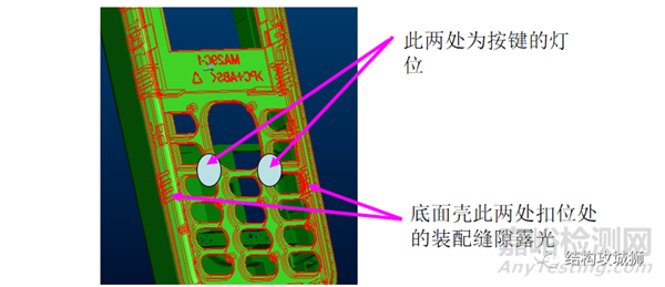 1,結(jié)構(gòu)上存有能使光直接射出的縫隙而露光,無擋光的結(jié)構(gòu)或擋光的位置不夠,如底面殼按鍵側(cè)有被切斷的止口處,按鍵間隙處等。