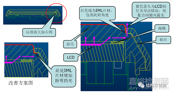 露光原因?yàn)镮ML片材(PET)包膠到側(cè)面底部(如下右圖),前殼為透明PC料,有導(dǎo)光性,而前殼與前殼鋁片有配合間隙而露光,下圖為L(zhǎng)CD區(qū)域的模截面剖視圖: