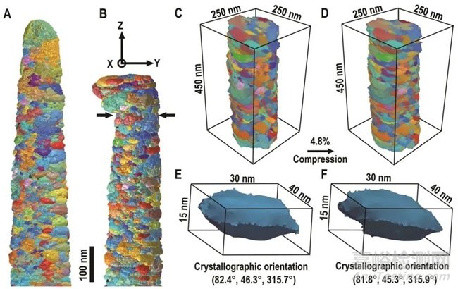 納米金屬鎳變形前(A)和變形后(B)三維形貌與晶體取向變化