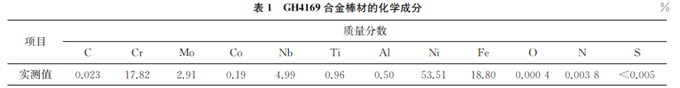 試驗(yàn)材料為真空感應(yīng)熔煉(VIM)+真空自耗重熔(VAR)雙聯(lián)熔煉工藝生產(chǎn)的 GH4169合金鍛制棒材,其化學(xué)成分如表1所示。
