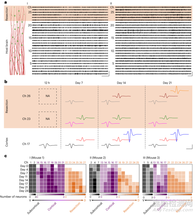 為了跟蹤和刺激神經(jīng)元再生,團隊還將 32 個可單獨尋址的 20 μm 直徑的鉑金微電極整合到層粘蛋白包被的支鏈聚合物支架中,最后把支架立體定向植入到小鼠模型中。