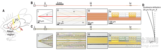 這種探針采用網(wǎng)狀設(shè)計,包含16個不同的記錄元件,通過導(dǎo)管經(jīng)頸內(nèi)動脈釋放。這種探針類似血管支架,能夠自發(fā)擴張,記錄血管壁上的神經(jīng)元信號。由于極小的尺寸,探針能夠到達此前無法進入的<100 µm血管分支,記錄大腦中動脈(MCA)和大腦前動脈(ACA)的不同放電模式,二者分別覆蓋皮層和嗅球。
