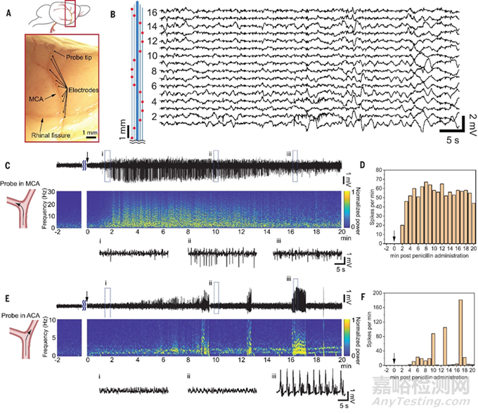 研究團隊在在植入探針的半球皮層注射了青霉素誘導(dǎo)局部癲癇發(fā)作。該探針所有16個通道的同時記錄僅在三個相鄰?fù)ǖ乐凶R別出尖峰,證明了探針定位和追蹤癲癇灶的能力。