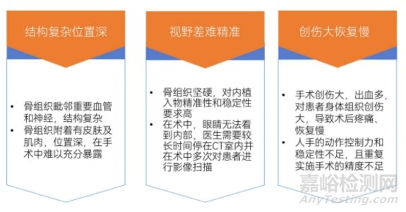 傳統(tǒng)骨科手術(shù)面臨結(jié)構(gòu)復(fù)雜位置深、視野差難精準(zhǔn)、創(chuàng)傷大恢復(fù)慢的問題。目前,我國骨科手術(shù)大部分處于影像引導(dǎo)時(shí)代,術(shù)中面臨“結(jié)構(gòu)復(fù)雜位置深、視野差難精準(zhǔn) 、創(chuàng)傷大恢復(fù)慢”的難題,具體如下圖。