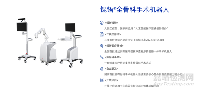2022年4月,自主研發(fā)的錕铻®機(jī)器人獲得NMPA的上市批準(zhǔn),成為我國第一且唯一一款進(jìn)入NMPA創(chuàng)新醫(yī)療器械(綠色通道)特別審查程序并獲準(zhǔn)上市的開放式植入物數(shù)據(jù)全膝關(guān)節(jié)置換手術(shù)機(jī)器人系統(tǒng)。該產(chǎn)品各項(xiàng)性能指標(biāo)達(dá)到國際同品類器械水平。