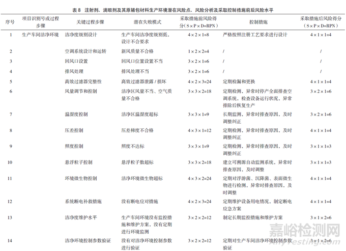 RPN為嚴(yán)重性(對產(chǎn)品質(zhì)量的影響程度)、可能性(風(fēng)險(xiǎn)產(chǎn)生的可能性程度)和可檢測性(潛在風(fēng)險(xiǎn)造成危害前,對其發(fā)生的可能性進(jìn)行監(jiān)測)三者的乘積。當(dāng)RPN>16時(shí),風(fēng)險(xiǎn)等級為高風(fēng)險(xiǎn)水平;當(dāng)8≤RPN≤16時(shí),為中等水平;當(dāng)RPN<8時(shí),為低風(fēng)險(xiǎn)水平。對注射劑、滴眼劑及其原輔包材料的生產(chǎn)環(huán)境評估結(jié)果見表8。
