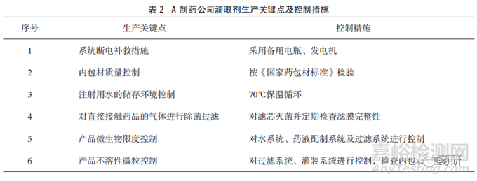 A制藥公司有多條生產(chǎn)滴眼劑的吹灌封生產(chǎn)線,注冊批準(zhǔn)工藝中生產(chǎn)車間的潔凈級別要求為C+A級,日常監(jiān)測可達(dá)到規(guī)定級別,每年對潔凈環(huán)境控制參數(shù)進(jìn)行一次驗(yàn)證。通過調(diào)查獲得的該企業(yè)產(chǎn)品生產(chǎn)潔凈環(huán)境風(fēng)險(xiǎn)控制參數(shù)及措施見表1,生產(chǎn)關(guān)鍵點(diǎn)及控制措施見表2。調(diào)研過程發(fā)現(xiàn)生產(chǎn)車間內(nèi)微生物監(jiān)測數(shù)值較高的區(qū)域?yàn)槿?物流區(qū)域及清洗區(qū)域,車間控制微生物的措施有高溫高壓融化粒料,除菌過濾直接接觸藥品的氣體,蒸汽滅菌每批產(chǎn)品生產(chǎn)使用的濾芯并檢查濾膜完整性。