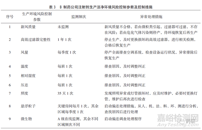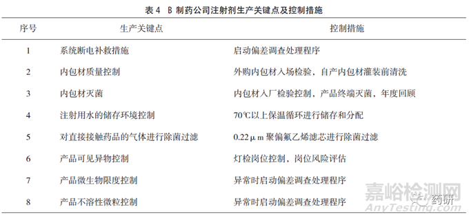 B制藥公司具有多條注射液產(chǎn)品線,其注冊批準(zhǔn)工藝中生產(chǎn)車間的潔凈級別要求為C+A級,日常監(jiān)測可達(dá)到規(guī)定級別,對空調(diào)系統(tǒng)的再驗(yàn)證周期為2年,每年定期評估,其生產(chǎn)環(huán)境風(fēng)險(xiǎn)控制參數(shù)及措施見表3。車間生產(chǎn)線安裝有粒子自動(dòng)監(jiān)測系統(tǒng),微生物控制建立有相應(yīng)標(biāo)準(zhǔn)。其他生產(chǎn)關(guān)鍵點(diǎn)和控制措施見表4。
