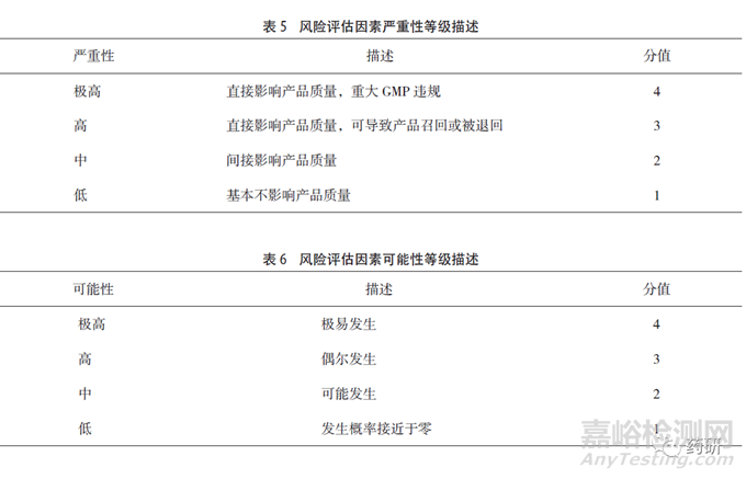 接下來運(yùn)用FMEA方法,對風(fēng)險(xiǎn)源的嚴(yán)重性、可能性和可檢測性進(jìn)行分析和評估,并按照評估得分,計(jì)算RPN。評定標(biāo)準(zhǔn)分別見表5、表6和表7。
