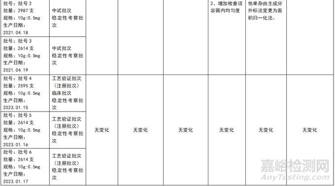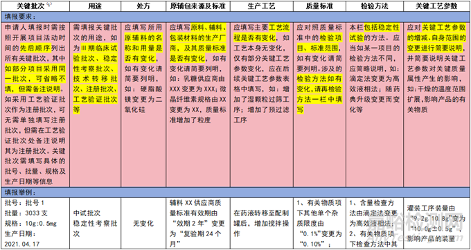 3. 關(guān)鍵批次與申報(bào)資料變化情況匯總表(此處加蓋申請(qǐng)人公章)