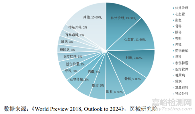 醫(yī)療健康行業(yè)發(fā)展受經(jīng)濟(jì)周期影響相對較小,醫(yī)療器械的發(fā)展與醫(yī)療健康行業(yè)整體發(fā)展密切相關(guān)。從細(xì)分市場的情況來看,體外診斷、心血管、醫(yī)學(xué)影像和骨科是醫(yī)療器械行業(yè)中最大的細(xì)分市場。如下圖所示,2017年,體外診斷市場規(guī)模 52.60 億美元, 排名第一;骨科醫(yī)療器械市場規(guī)模 36.50 億美元,排名第四。