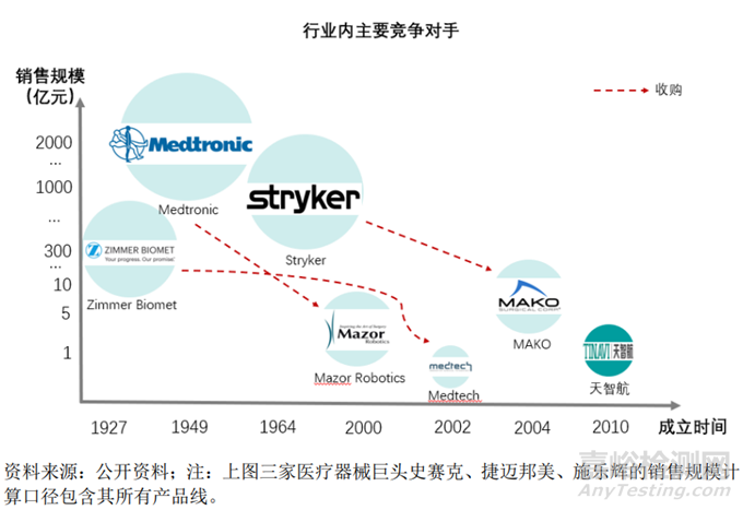 基于對手術(shù)機器人可能帶來的競爭沖擊,近年來,史賽克、美敦力、捷邁邦美等骨科巨頭憑借資金實力優(yōu)勢,紛紛通過收購各國骨科手術(shù)機器人初創(chuàng)企業(yè)獲得技術(shù)來源,完成了骨科手術(shù)機器人行業(yè)的產(chǎn)業(yè)布局,具體情況詳見下圖: