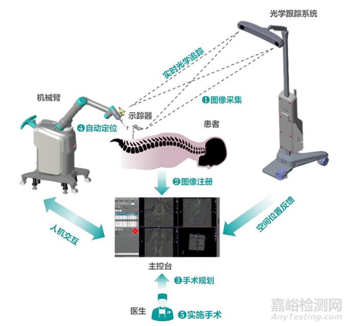 醫(yī)生通過術(shù)前CT或術(shù)中C形臂X射線機獲取患者醫(yī)學(xué)影像,圖像傳送至機械臂臺車并完成識別后,醫(yī)生在機械臂臺車進(jìn)行骨骼參數(shù)、內(nèi)固定螺釘?shù)姆较?、入點等手術(shù)設(shè)計,完成整體手術(shù)規(guī)劃;機械臂依據(jù)醫(yī)生規(guī)劃實現(xiàn)精確定位,輔助進(jìn)行手術(shù);并通過光學(xué)跟蹤系統(tǒng)進(jìn)行實時位置監(jiān)控和伺服控制,確保手術(shù)安全。骨科手術(shù)機器人能夠提升手術(shù)精度、減少手術(shù)創(chuàng)口和輻射暴露,幫助患者實現(xiàn)快速恢復(fù)。
