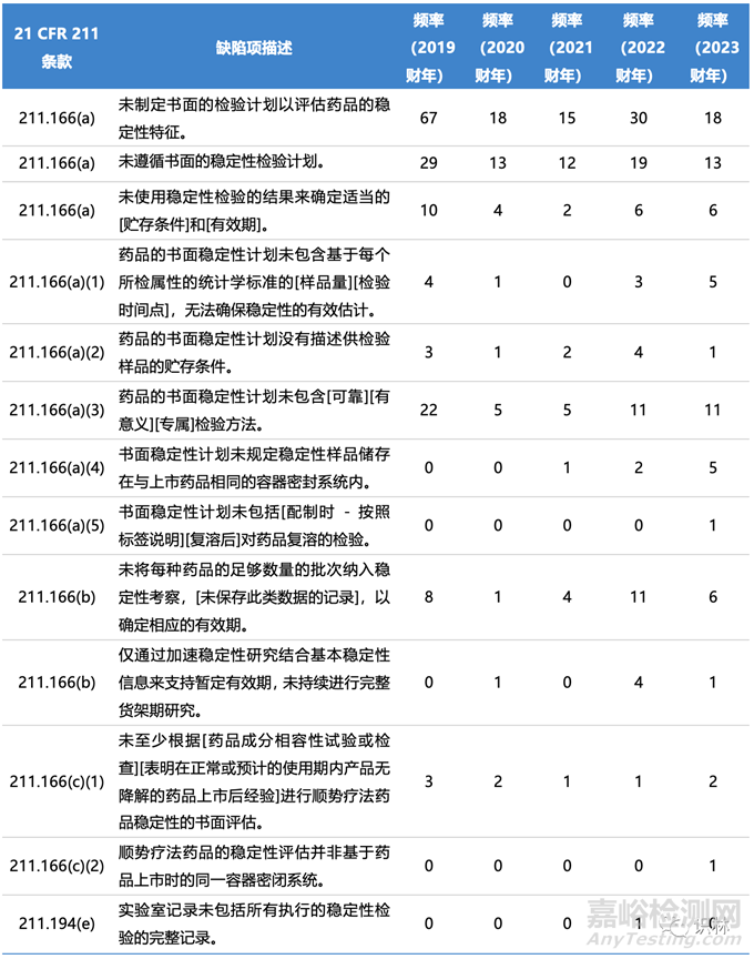 表1. FDA近年來483表涉及穩(wěn)定性的缺陷項(xiàng)和出現(xiàn)頻率