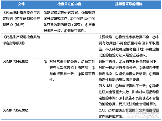 除法規(guī)要求外,中美監(jiān)管機(jī)構(gòu)/組織也制定了相應(yīng)的檢查工作程序或合規(guī)手冊(cè),明確了穩(wěn)定性的檢查范圍、要求及風(fēng)險(xiǎn)的判定原則,并列舉了穩(wěn)定性相關(guān)的檢查缺陷,見表2。