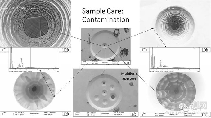 上圖中是對(duì)一個(gè)“正常”運(yùn)行中被污染物堵掉的多孔鉑制光闌Multi-hole Platinum Aperture的簡(jiǎn)單失效分析,樣品來(lái)自國(guó)內(nèi)一知名金屬研究所的采用西門(mén)子booster專(zhuān)利的熱場(chǎng)掃描電鏡;形貌分析Topography顯示污染物在光闌孔內(nèi)上產(chǎn)生結(jié)晶Crystalization,逐層生長(zhǎng),直到全部光闌孔徑內(nèi)全部被堵死;X射線能譜分析顯示污染物主元素由碳,氧,硅等成分構(gòu)成;加上在檢測(cè)限之外的氫元素,這個(gè)結(jié)果和有機(jī)質(zhì)的成分基本吻合;