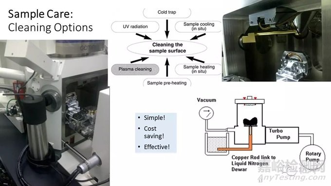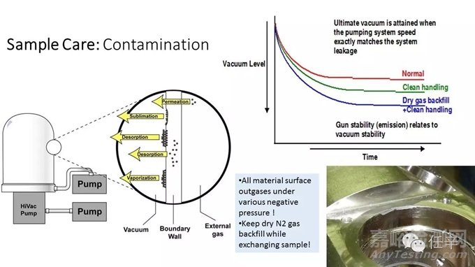 還有,對(duì)于發(fā)氣Outgassing、和多孔Porous的樣品,預(yù)抽Pre-pumping應(yīng)該是最基本的樣本照料手段,有條件的用戶(hù)最好能在加熱的環(huán)境下預(yù)抽,以提高清潔效率;有樣品交換倉(cāng)loadlock的用戶(hù),多數(shù)會(huì)忘記loadlock是可以做原位的In-Situ預(yù)抽清潔操作的;這樣的原位預(yù)抽,比起單獨(dú)使用的真空預(yù)抽設(shè)備來(lái),杜絕了樣品在二次轉(zhuǎn)移過(guò)程中再次暴露在大氣中所造成的二次污染,可以以真空對(duì)真空,直接將樣品從真空換樣室推送進(jìn)真空樣品倉(cāng);