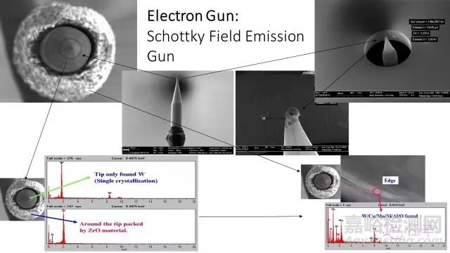 我們還看到,光闌結(jié)晶污染物的能譜中還有鋯Zr元素;熱場(chǎng)燈尖的鎢單晶上鍍有氧化鋯ZrO涂層,所以這里有很大的可能性是:過(guò)熱的熱場(chǎng)燈尖在被強(qiáng)電場(chǎng)和高熱量“混合驅(qū)動(dòng)”產(chǎn)生電子束的同時(shí),也攜帶下一些ZrO鍍層中的鋯元素,最終也組成了導(dǎo)致光路堵塞的污染源的一部份;另一種可能性是:這個(gè)被標(biāo)為鋯的元素不是Zr,鉑Pt和鋯的部分能譜峰線較為接近,在較低激發(fā)能量下,被誤判成了Zr;